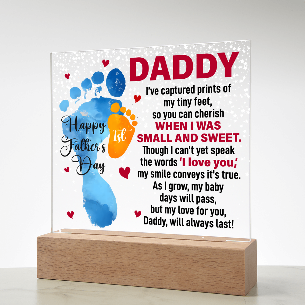 Your plaque will be crafted from premium acrylic with a professionally printed design for a polished look. It comes with a stylish wooden LED base, and you can choose between a USB plug-in option OR a cordless battery-operated option (requires 2 AAA batteries, not included). Both LED bases feature 7 vibrant colors, allowing the user to customize the lighting with various color changes and dynamic cycles.